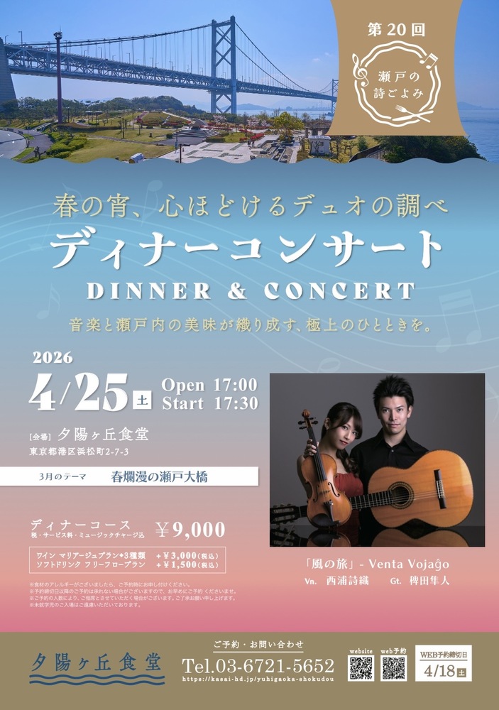 瀬戸の詩ごよみ SCHEDULE 2026/04/25(土) ⭐️4/25(土)18:30開宴 瀬戸の詩ごよみ【風の旅】 夕日丘食堂 https://kasai-hd.jp/yuhigaoka-shokudou URLをコピーする 報告する