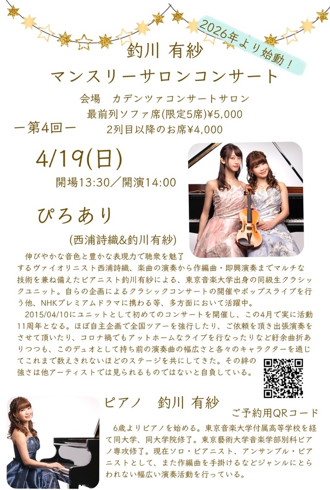釣川有紗マンスリーサロンコンサート SCHEDULE 2026/04/19(日) ⭐️4/19(日)14:00開演 釣川有紗マンスリーサロンコンサート https://passmarket.yahoo.co.jp/event/show/detail/02vwfi76hey41.html URLをコピーする 報告する