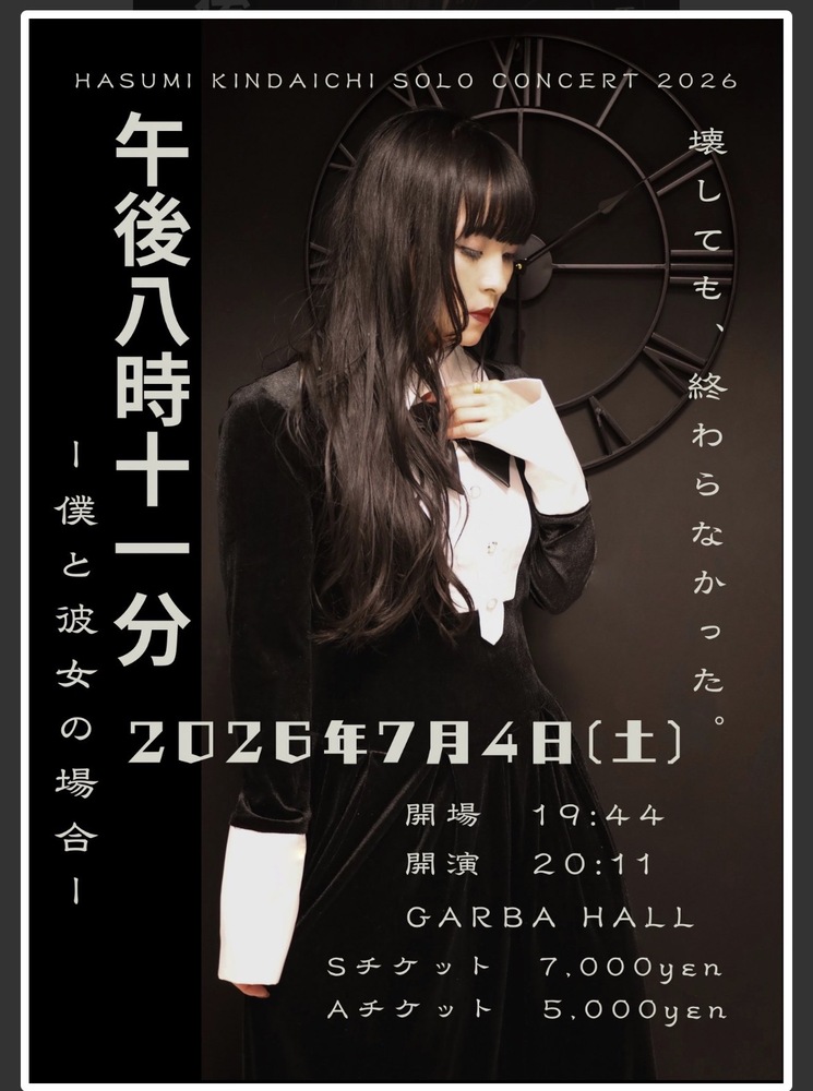 Hasumi Kindaichi solo concert 2026【午後八時十一分】-僕と彼女の場合- SCHEDULE 2026/07/04(土) https://tiget.net/events/463535 URLをコピーする 報告する